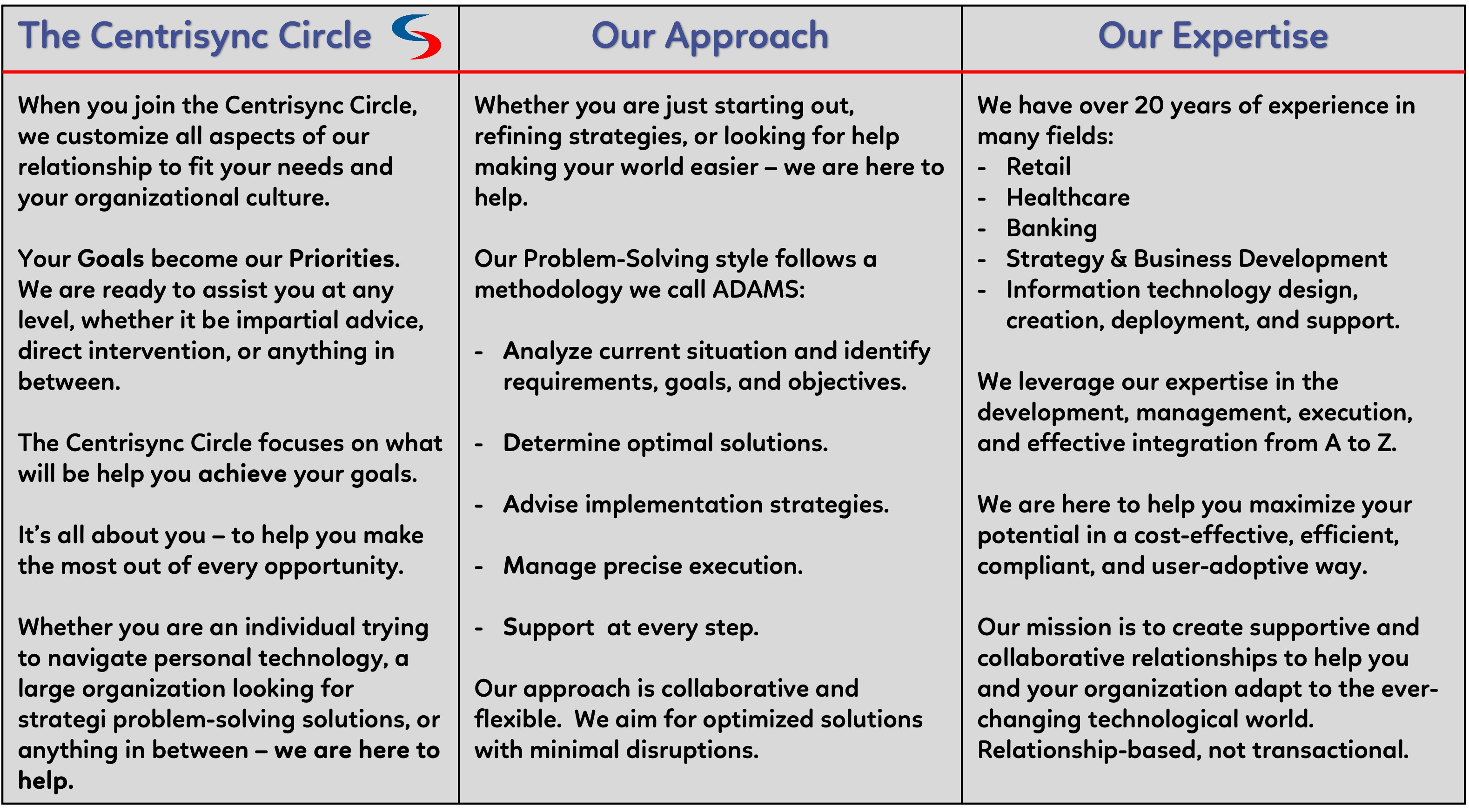 We help organizations of all sizes, individuals, and non-profits: Centralize, Synchronize, Organize, and Manage constantly changing technology needs.